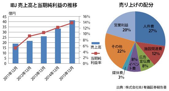 【左】IBJ 売上高と当期純利益の推移。【右】IBJ 売上の配分。(注)「その他」は、金額の少ない費目を足し込んだもの。