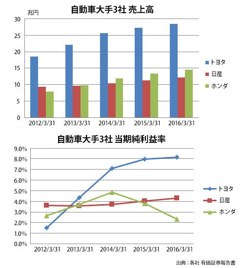 【上】自動車大手3社 売上高。【下】自動車大手3社 当期純利益率。