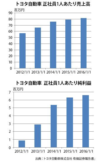 【上】トヨタ自動車 1人あたり売上高。【下】トヨタ自動車 1人あたり純利益。