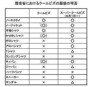 環境省が定めるクールビズの服装の可否。○は可、(○)は可だが徹底されていない、△はTPOに応じた節度ある着用に限り可、×は原則不可。