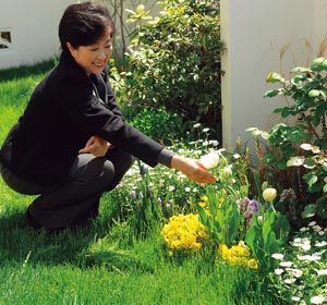 自宅の庭の花壇の前で微笑む小池氏。小池氏の母親も病床からこの花を眺めたのだろう。(写真は、『発電する家「エコだハウス」入門』より)