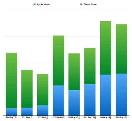 筆者の会社における、iTunes StoreとApple Musicの売上推移(2015年7月~2016年2月)。ダウンロード販売の実績(iTunes Store、緑)に大きな落ち込みは見られないが、ストーミング再生の売上(Apple Music、青)が確実に伸びており、増収傾向にあることが分かる。