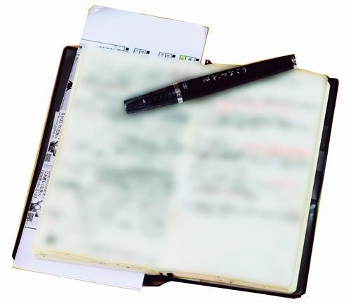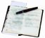 社員向け手帳を使用。税務の基礎等を収録。万年筆の側面に記した「心を、つなごう」は社の経営ビジョン。