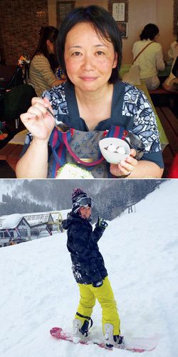 【上】疲れたときは、スイーツでリフレッシュ。休日には、都内で人気のスイーツ店を食べ歩き。【下】気の合う仲間と一緒にスノーボード。シーズン中は月2、3回、新潟方面へ行く。温泉と食事も楽しみのひとつにしている。