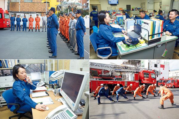 【左上から時計回りに】人員確認や点検を行い、前任者の業務を引き継ぐ。/当日の担当業務について、部署内で打ち合わせ。/人命救助に必要不可欠な体力維持のトレーニング。/勤務中は随時、災害現場からの無線報告を処理。