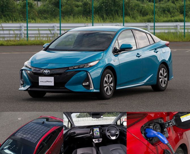 新型プリウスPHV。ルーフ部分には太陽電池パネルが搭載されている(左下)。カーナビは11.6インチの縦型大型ディスプレイ(中)。普通充電インレットを左、急速充電インレットを右に配置(右)