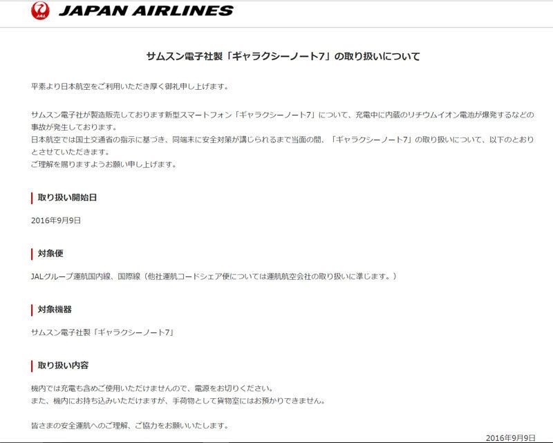 航空各社はGalaxy Note 7を通電状態のままで飛行機に乗らないように、という警告を出した。