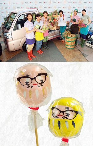 (上)ダイハツ工業から発売されたピンク色の軽トラックの発表会イベントでの昭恵夫人(右から3番目)。(時事通信社=写真)(下)直径約4cmの白河だるま。眼鏡のパッケージで、3万5000個が商業施設「ルミネ」のノベルティに使われた。