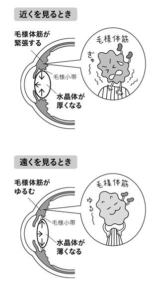 近くを見るときは毛様体筋が緊張(収縮)し、遠くを見るときには毛様体筋が緩む。近くを見るときのほうがピント調節力が必要になるので、毛様体筋の柔軟性が損なわれると手元が見づらくなる。
