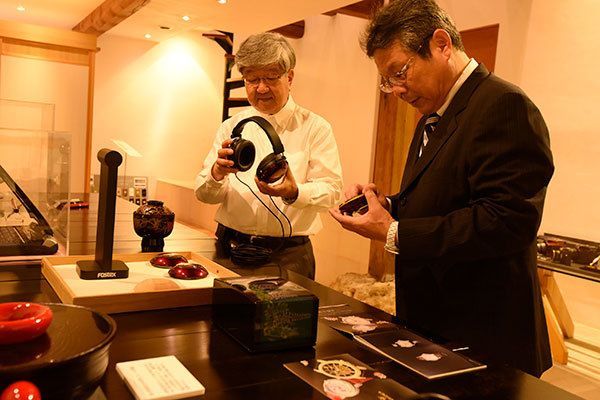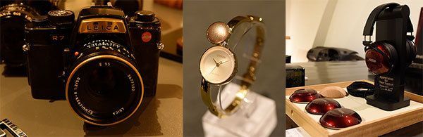 坂本社長が見出した漆加工技術に、大手メーカーの引き合いが絶えない。独ライカ社の限定生産カメラ(左、95年)、シチズン製腕時計の文字盤の横に施された漆玉(中、96年)、フォスター電機製ヘッドフォンは木製の高級品(右、11年~)