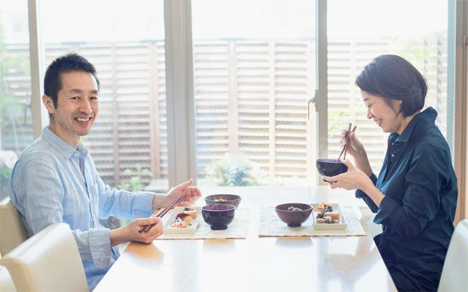 運営する「スタジオNagomi」のセミナールームで仲良く向き合って昼食を食べる。