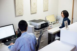仕事中の風景。未千さんは5月に『1枚のアンケート用紙で「新規顧客」が「100回顧客」に変わる!』(かんき出版)を出版。