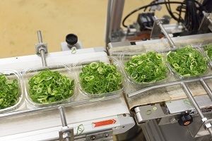 大量の九条ねぎが整然と加工されていく。
