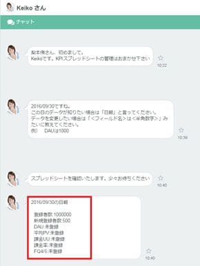 SMART MessageとGoogleスプレッドシートとの連携機能。チャットで「日報」と入力するだけで、必要な情報を拾い出して日報を作成できる。(拡大すると画面全体を表示)
