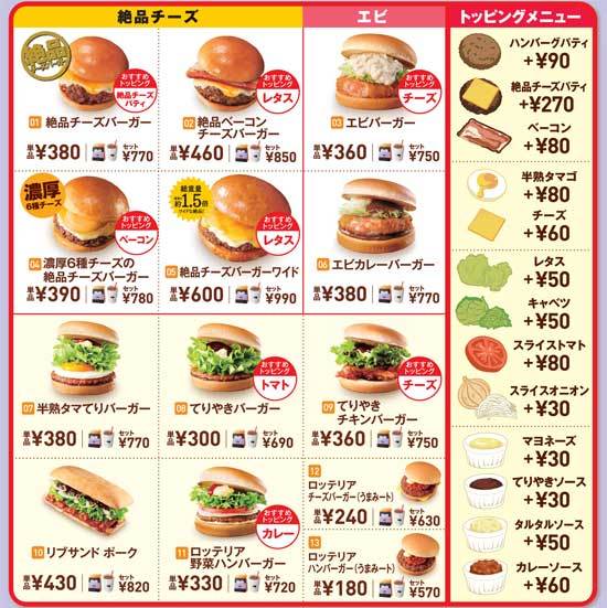 ロッテリアの最新メニュー(2016年10月)。クリックすると全体を表示。