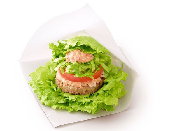 「菜摘」はバンズの代わりにレタスでパティを挟んだハンバーガー。写真の「モスの菜摘 ソイモス野菜」は、肉ではなく大豆由来のソイパティを挟んでおり、約155kcalと低カロリーな商品。これ一つで生野菜を約120グラム摂取できる。
