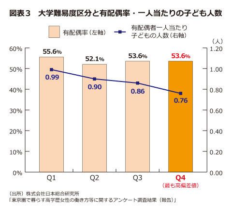 図表3 大学難易度区分と有配偶率・一人当たりの子ども人数