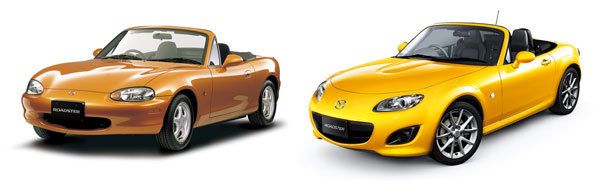 2代目ロードスター(1998年、左)、3代目ロードスター(2005年発表、右)。