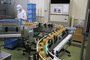 加工場では、主力商品のひとつであるみかんジュースが続々とできあがっていた。