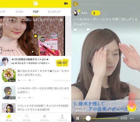 動画ファッションマガジン「C Channel」のトップページ(左)。スマートフォンでの表示にあわせて、縦長の動画を配信している(右)。