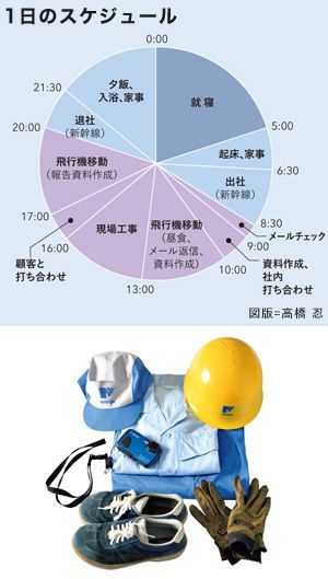 (上)齋藤さんの1日のスケジュール(下)ヘルメット、作業着、手袋、安全靴な ど、どれも現場作業には欠かせない。調査用カメラも常に携帯している。