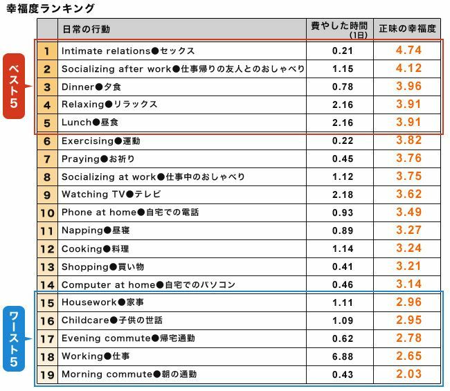 プリンストン大学 ダニエル・カーネマン教授らがテキサスで働く909人の女性を調査した「幸福度ランキング」より。*正味の幸福度(ポジティブ感情からネガティブ感情を引いたもの)を集計して上位から並べたもの。