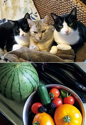 (上)仕事の疲れをいやしてくれる猫たち。4匹飼っている。自分でデザインした製品の中には、ネコのデザインを入れて作ったものも。(下)家庭菜園が好きで、さまざまな野菜を収穫できる。昨年は日よけもゴーヤカーテンではなく、キュウリカーテンにチャレンジ。
