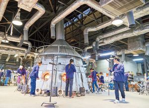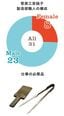 (上)女性職人も毎年増え、今年も2人加わった。班長レベル以上の女性は、内藤さんのみ。(下)右がハシ(ジャック)。軟らかいガラスをくくったりして形を作る。左はコテ板。ガラスの底を平らに整える道具。