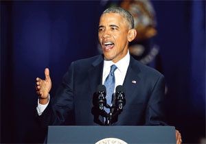 退任演説で2期8年の成果を訴えるオバマ前大統領。(時事通信フォト=写真)