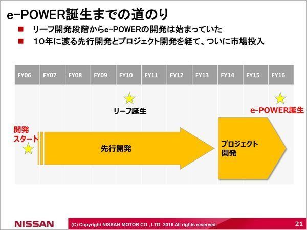 e-POWERの正式な商品企画がスタートしたのは2014年。しかし2007年から、社内有志による先行開発が始まっていた。電気自動車のリーフは2010年、ノートe-POWERは2016年に発売された。