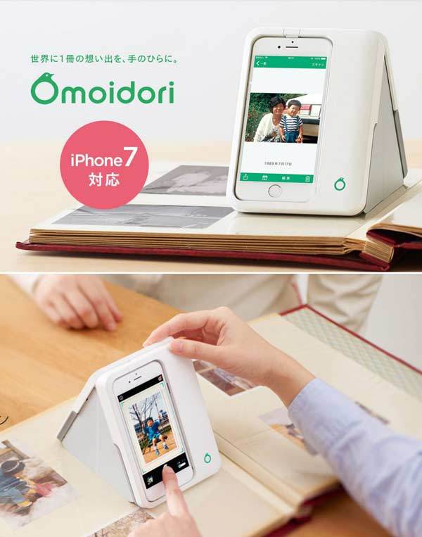 OmoidoriにiPhoneをセットし、写真の上に載せるだけ。アルバムの透明フィルムの上からでもスキャンできる。スキャンした画像データは、Dropboxなどのクラウドサービスで共有したり、フォトブックをつくったりという楽しみ方も。