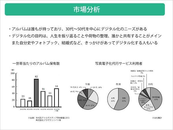 企画書にはボツになった名称がたくさん掲載されている。「写真が反射しない」から「TOBAN」「ピカルナ」、シャッター音が2回鳴るので「DualSCAN」など。「アルバム=家族の大切な記憶や思い出をのこすツール」ということでOmoidoriに決まった。