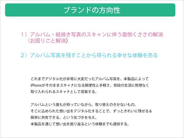 企画書にはボツになった名称がたくさん掲載されている。「写真が反射しない」から「TOBAN」「ピカルナ」、シャッター音が2回鳴るので「DualSCAN」など。「アルバム=家族の大切な記憶や思い出をのこすツール」ということでOmoidoriに決まった。