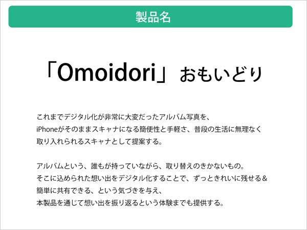企画書にはボツになった名称がたくさん掲載されている。「写真が反射しない」から「TOBAN」「ピカルナ」、シャッター音が2回鳴るので「DualSCAN」など。「アルバム=家族の大切な記憶や思い出をのこすツール」ということでOmoidoriに決まった。