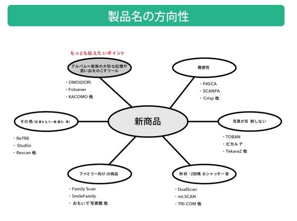 企画書にはボツになった名称がたくさん掲載されている。「写真が反射しない」から「TOBAN」「ピカルナ」、シャッター音が2回鳴るので「DualSCAN」など。「アルバム=家族の大切な記憶や思い出をのこすツール」ということでOmoidoriに決まった。