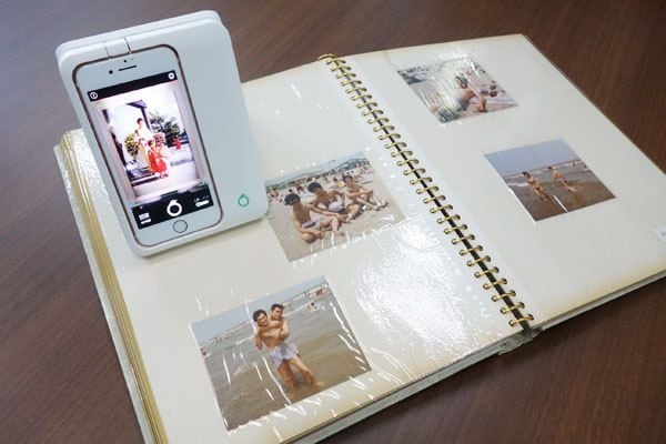 OmoidoriにiPhoneをセットし、写真の上に載せるだけ。アルバムの透明フィルムの上からでもスキャンできる。スキャンした画像データは、Dropboxなどのクラウドサービスで共有したり、フォトブックをつくったりという楽しみ方も。