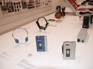 It`s a Sony展で展示されているウォークマン(中央)と、その原型となったプレスマン(右)。ウォークマンに付属されていたステレオヘッドホン(左)。