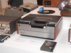 ベータマックス第1号(SL-6300)とビデオカセットテープ。奥にあるのがLP盤上を走り回ってレコードの音を聞かせる「CHOROCCO(チョロッコ)」。ソニーにはこんな製品もあった。