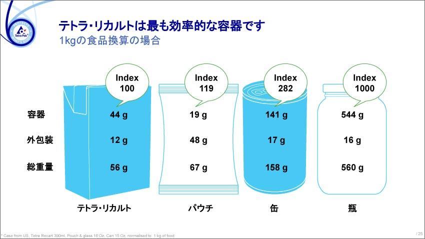 1kgの食品を入れる容器の重さを比較。テトラ・リカルト(56g)を100%とすると、パウチは119%、缶は282%、瓶は1000%となる(企画書より)。