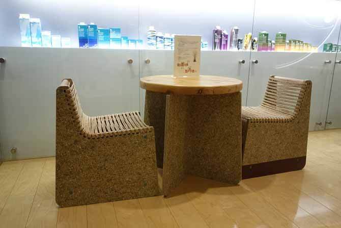 テトラ・リカルトが日本でも普及すれば、紙部分をリサイクルできるようになる。写真は日本テトラパック本社で使われている、紙容器をリサイクルして作ったデザイン家具の例。