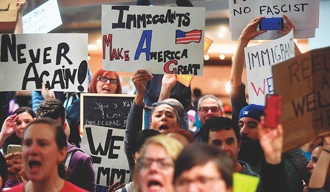 デモで掲げられた「移民がアメリカを偉大にする」――「入国制限」の大統領令に対し、全米各地では抗議デモが起きた。写真は1月29日、米西部サンフランシスコ国際空港での様子。トランプ大統領の主張「アメリカを再び偉大にする」を踏まえて、「Immigrants Make America Great(移民がアメリカを偉大にする)」と書かれたプラカードもあった。(時事通信フォト=写真)