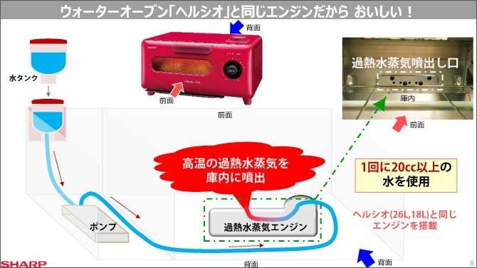 ヘルシオグリエの構造を背後から見たところ。本体上部の水タンクに入れた水がポンプで背面に送られ、過熱水蒸気エンジンで水蒸気に変えられる。