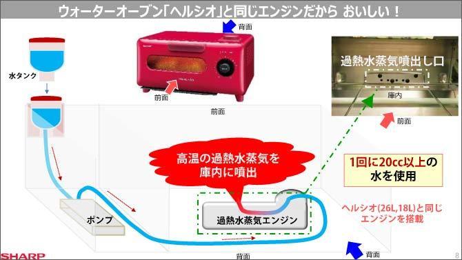 ヘルシオグリエの構造を背後から見たところ。本体上部の水タンクに入れた水がポンプで背面に送られ、過熱水蒸気エンジンで水蒸気に変えられる。