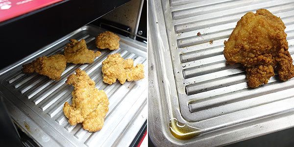 唐揚げなど、揚げ物を加熱すると、外はカリッと中はジューシーに温まる(左)。過熱した水蒸気が食品の中に入り込んで温めるので、余分な油が抜けてヘルシー(右)。