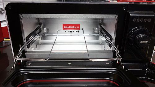 前面の扉を開けてトレイを外したところ。本体の奥の部分から過熱水蒸気を食品に吹き付けて、加熱する。