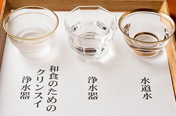 3種の水で奥井海生堂の蔵囲利尻昆布を一晩かけて水出しした昆布だし。このアングルではわかりにくいが、近寄ると左の「出汁をおいしくするための水」は褐色がかっている。