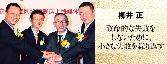 2009年4月16日、中国でユニクロ製品のネット通販開始を発表し、握手するファーストリテイリングの柳井正会長兼社長(中央右)とアリババグループの馬雲CEO(同左)ら(中国・上海)。(写真=時事通信フォト)
