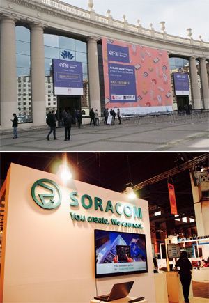 (上)会場はエスパーニヤ広場のフィラ・モンジュイク。(下)入り口正面を陣取ったソラコムのブース。