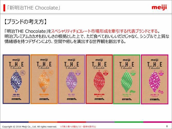 リニューアルしたザ・チョコは、旧製品の反省を踏まえ、ビター系2種(青、オレンジ)、ダークミルク2種(赤、紫)のラインアップで発売した。その後「ジャンドゥーヤ」(ナッツ系、緑)、「フランボワーズ」(ベリー系、ピンク)を1種ずつ追加し、現在は計6種の展開。