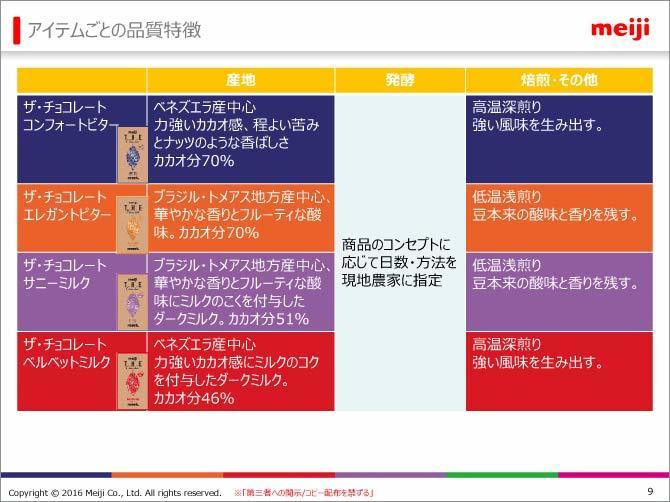 リニューアルしたザ・チョコは、旧製品の反省を踏まえ、ビター系2種(青、オレンジ)、ダークミルク2種(赤、紫)のラインアップで発売した。その後「ジャンドゥーヤ」(ナッツ系、緑)、「フランボワーズ」(ベリー系、ピンク)を1種ずつ追加し、現在は計6種の展開。
